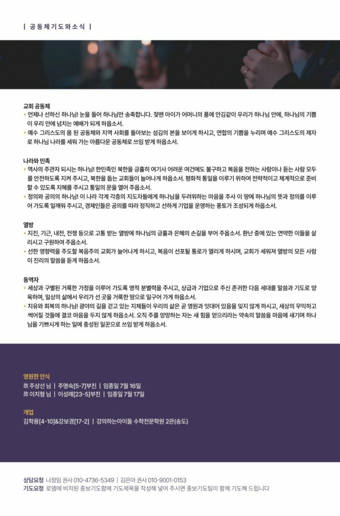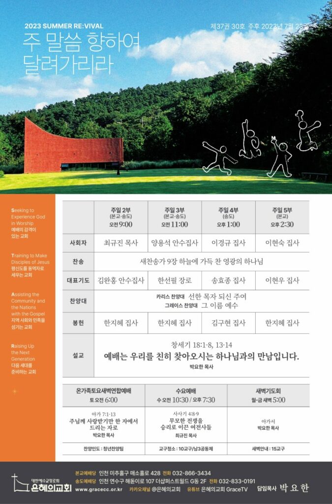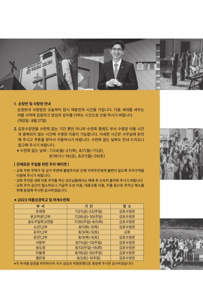 2023년 7월 23일(주일) 온라인 주보 | 2023-07-23 12:08 | 조회 : 2601 좋아요 0 싫어요 0 인쇄 « 교회 입구에 '우산'을 준비해두었습니다. 2023년 7월 30일 (주일) 주보 » 목록보기